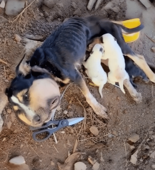 When rescuers arrived, the scene grew quiet. Khaleesi lay beneath the tree, puppies tucked against her side. Despite her fatigue, she lifted her head. She didn’t bark. She didn’t growl. She didn’t try to flee. Instead, she watched with soft eyes filled with caution—and hope. As if she sensed this moment mattered.