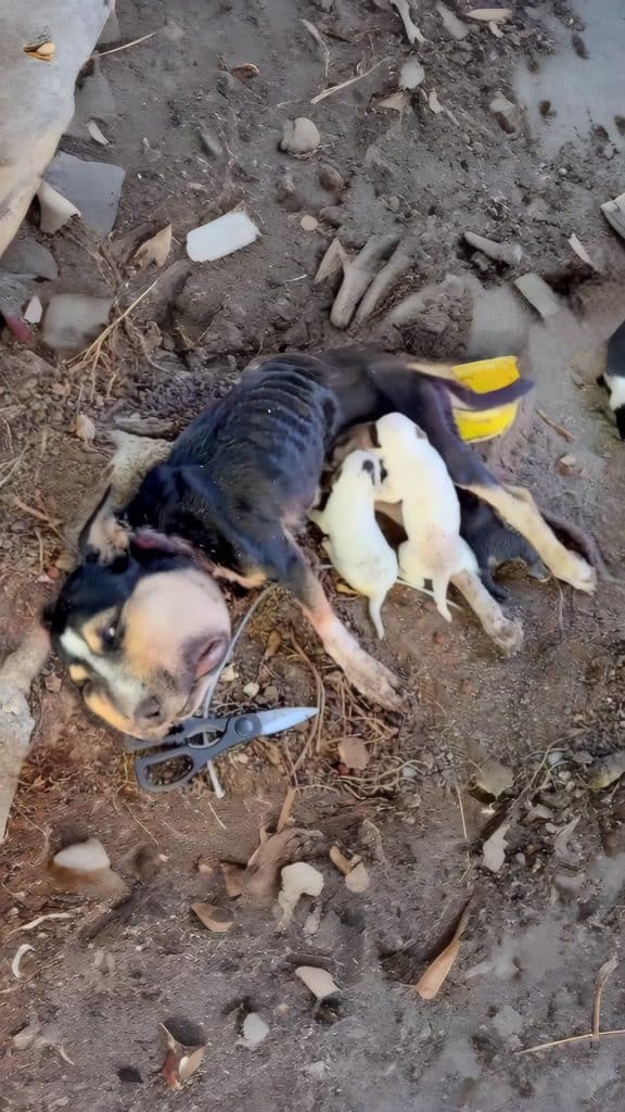 Khaleesi’s body showed clear signs of exhaustion. She was thin, her movements slow, her eyes carrying the weight of long days without care. Faint marks around her neck hinted at a past of confinement, a life once limited by restraint. The weather had not been kind—cold nights, harsh heat—but she stayed. She did not leave her puppies, not even briefly. Whatever strength she had left, she gave entirely to them.