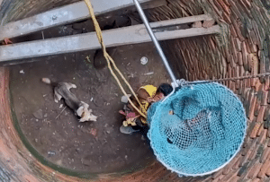 Instead of lifting the dog directly, the team lowered a wide rescue net into the well. The rescuer guided the dog inside, ensuring it was secure before giving the signal.