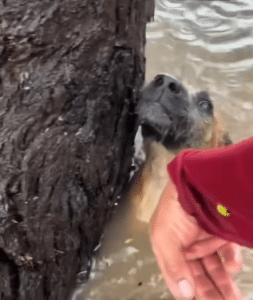 Barely visible above the water, the small dog clung to a low tree branch, its body shaking with exhaustion. The current tugged at its legs. Its grip was weak. When their eyes met, there was no sound—only fear, raw and urgent.