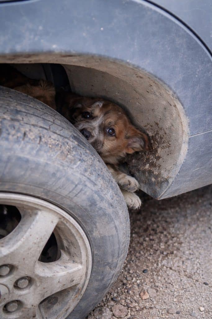 A tiny puppy was wedged tightly inside the rear wheel well.