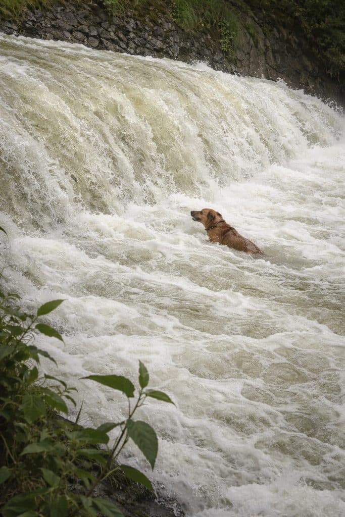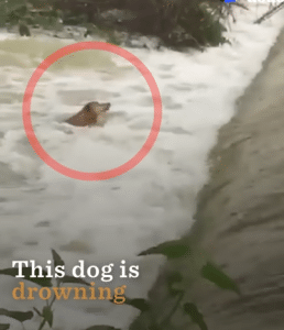 A brown dog was caught in the powerful current, pulled steadily toward the edge of a dam where the drop below was unforgiving. The water was dark and fast, pressing against his body with relentless force. He paddled hard to keep his head above the surface, but exhaustion was already setting in.