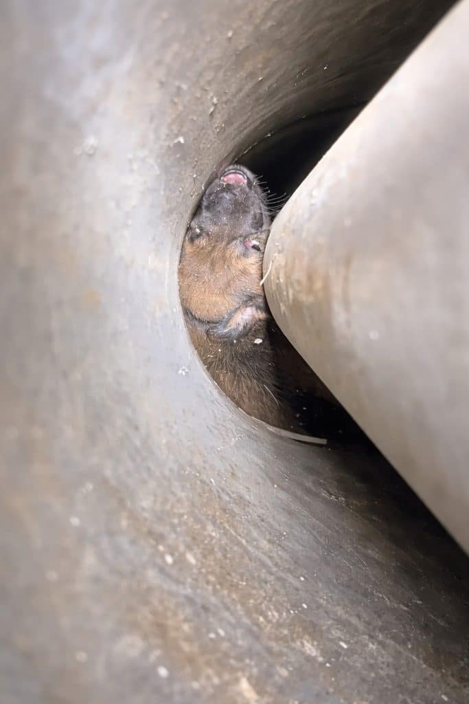 Neighbors gathered quickly as the situation became clear. Flashlights were lowered carefully into the pipe, revealing two small bodies far below. The puppies were alive, but trapped — coated in mud, unable to move, surrounded by tight walls and thinning air.