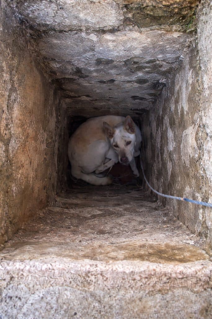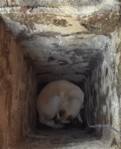 Along a quiet roadside, a white dog slipped into a deep, narrow pit hidden by uneven ground and shadow. The fall was sudden. The walls were steep. Once inside, there was no way out. Above him, the world continued on — unaware that below the surface, a life was trapped.