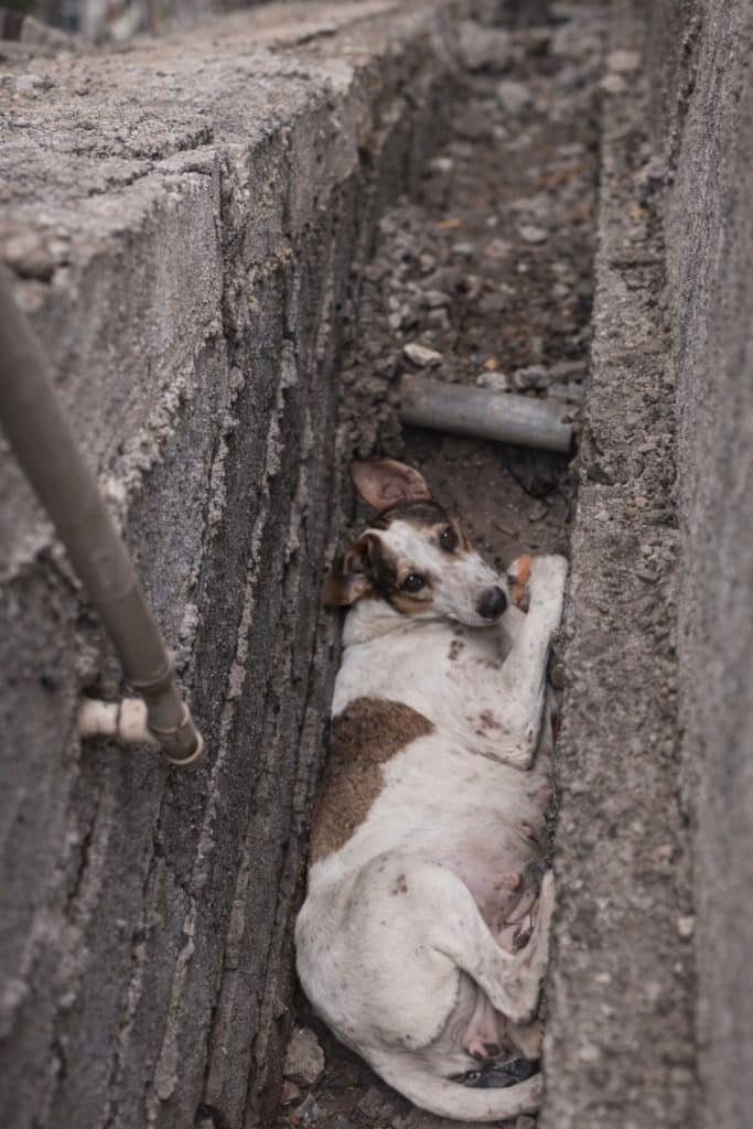But every attempt failed. The longer he remained trapped, the more fear took hold. Sounds echoed sharply in the confined space. Air felt limited. Exhaustion replaced resistance. With no clear path out and no one in sight, the dog could only wait — confused, frightened, and completely stuck.