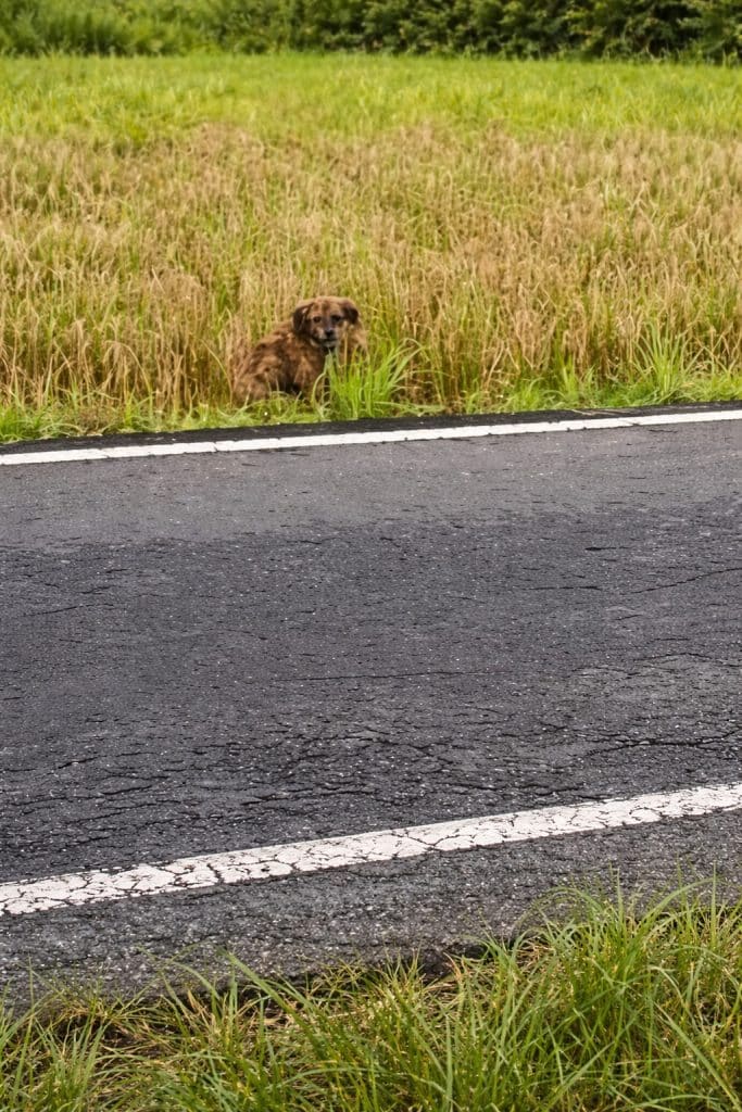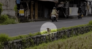 He simply stayed there—frozen in place, eyes wide, body tense. Every passing vehicle brought danger closer. One sudden movement could have sent him into traffic… or running into the nearby rice fields, never to be found again.
