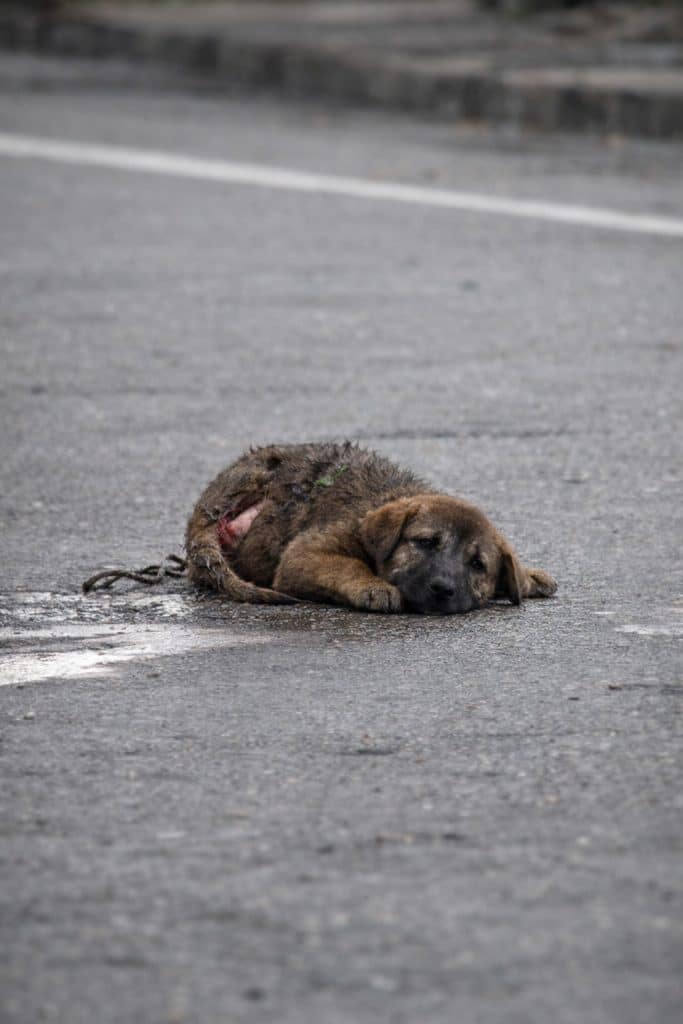 In the middle of a busy road, where cars passed without slowing, a small brown dog lay quietly in a shallow puddle. His body was painfully thin, ribs clearly visible beneath damp fur. He didn’t try to stand. He didn’t react to the noise around him.