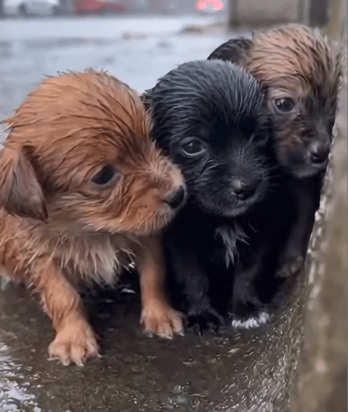 Hidden between the stones was a narrow crevice, barely enough to offer shelter. Inside it, three tiny puppies were pressed tightly together. Their fur was soaked, clinging to their small bodies. Each one trembled uncontrollably, sharing warmth the only way they knew how.