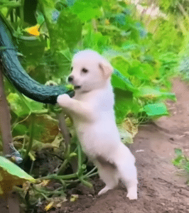 In the garden, the puppy balances clumsily on his hind legs, playfully nibbling at a cucumber hanging from a vine. His movements are awkward but joyful. His round belly hints at regular meals, and his tail wags without pause. The contrast is unmistakable. The puppy who once trembled in the rain now moves freely, discovering simple pleasures for the first time.