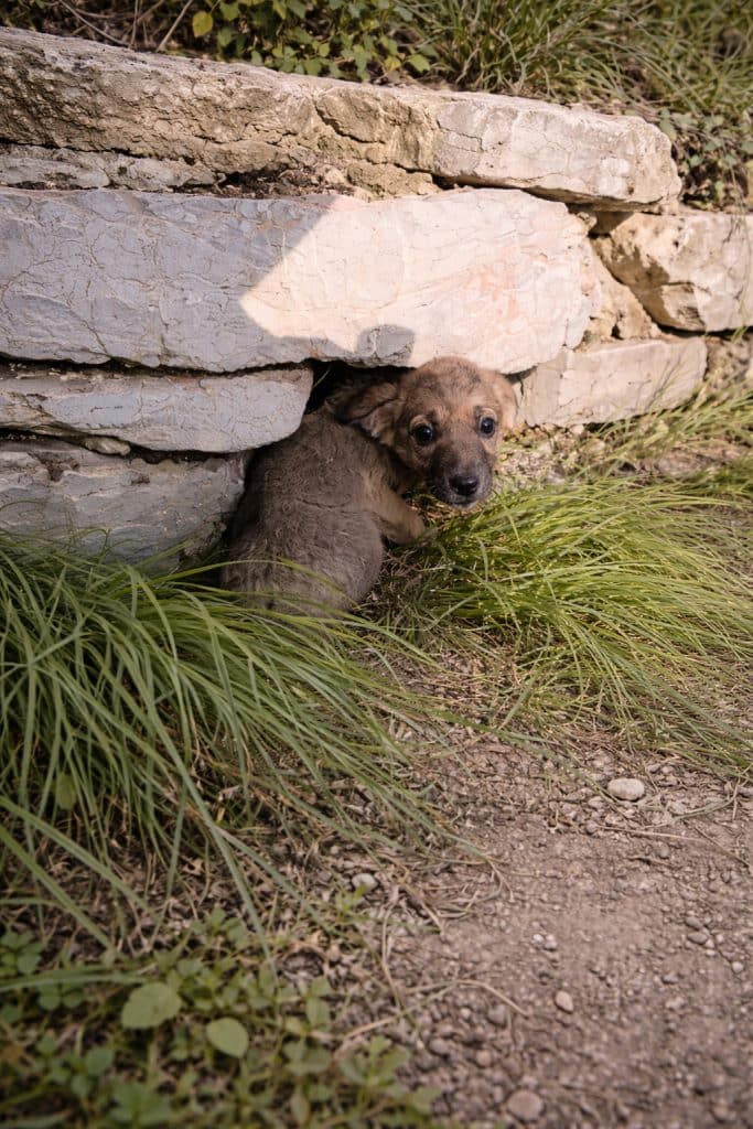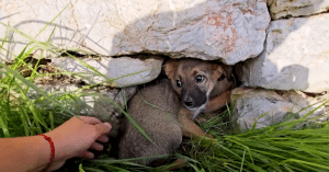 Along a roadside not far away, a man noticed something unusual near an old stone wall. Between the cracks, barely visible, was a small puppy pressed tightly into the shadows.