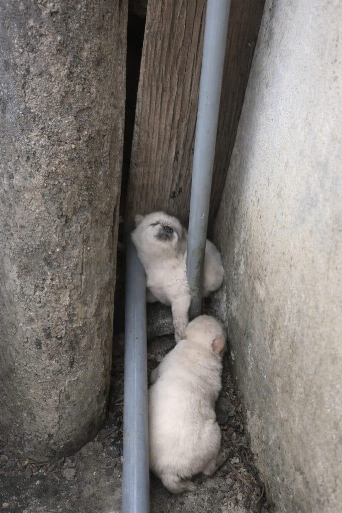 Between a cold concrete wall and a thick wooden post, there was a narrow gap filled with dirt, pipes, and darkness. It was not a place meant for life — yet inside that space, two tiny white puppies had been left behind.