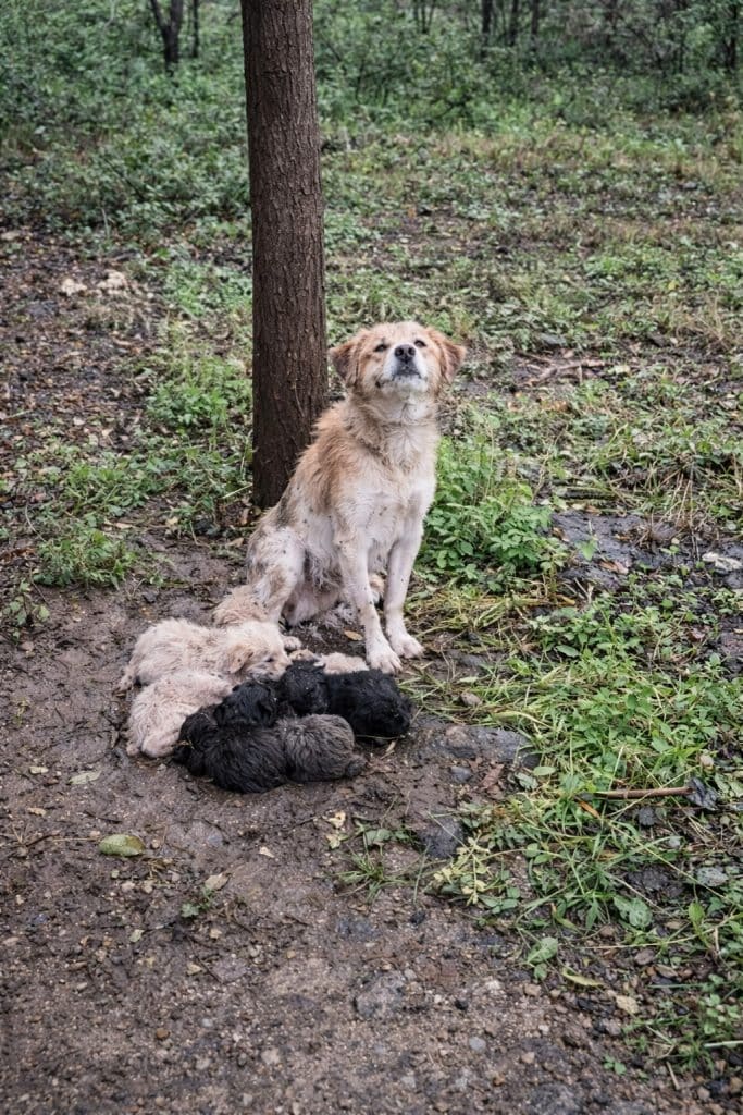Beneath a large tree, soaked from heavy rain, he found a small family huddled together. A thin mother dog pressed her body tightly around eight newborn puppies, no more than two weeks old. Their fur was wet. Their bodies trembled. The cold was unforgiving, dropping to nearly 2°C.