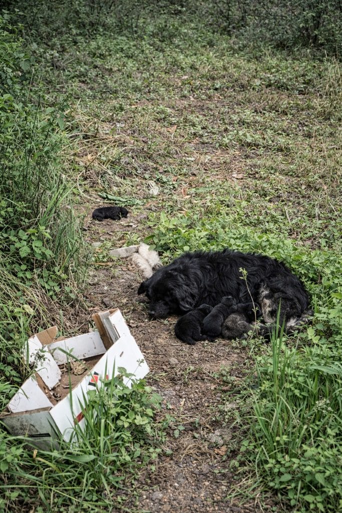Tall grass leaned inward, hiding a small, worn cardboard box pressed against the edge of the road. Inside it, a black mother dog lay curled tightly around her newborn puppies. They had been left there with nothing else — no shelter, no food, no sign that anyone would return.