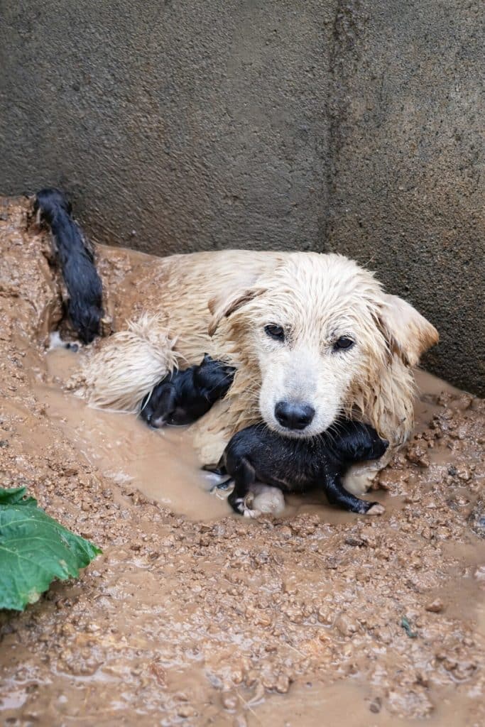Heavy rain poured down without warning, flooding the muddy hole she had relied on for shelter. Trapped by rising water and exhaustion, the mother dog went into labor right there, in the collapsing ground.