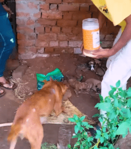 It came softly at first, soaking the dry earth in a quiet rural corner where a stray mother dog had made a fragile home beside an old dirt wall. She had chosen that spot for its shelter. It wasn’t perfect, but it offered protection from wind and sun.