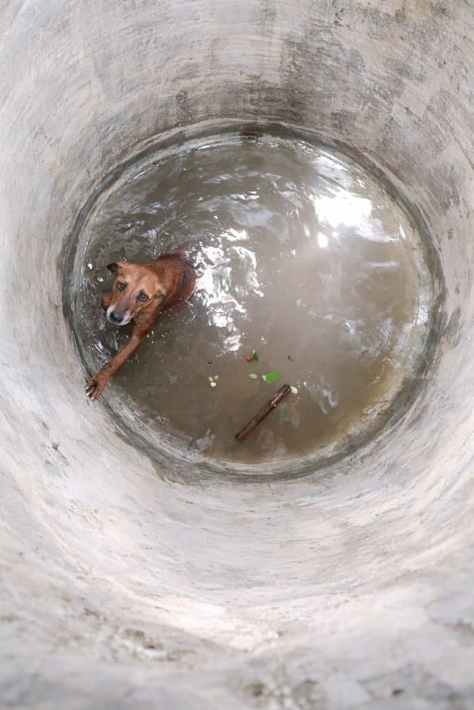 A narrow, deep water pit sat hidden from view. But inside, a pregnant dog was struggling to keep her head above the surface. The walls were steep and slick. There was no easy foothold. No clear way out.