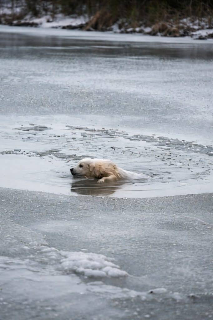 The cold was immediate and unforgiving. But he pushed forward, swimming toward the small figure that was barely keeping its nose above the surface.