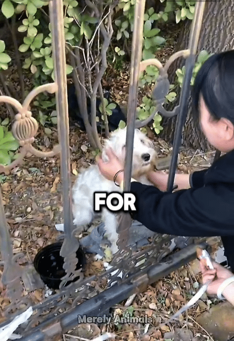 One of the girls moved behind the fence, gently supporting the dog’s body from inside. The other positioned herself on the outside, carefully guiding his head and shoulders through the narrow gap.