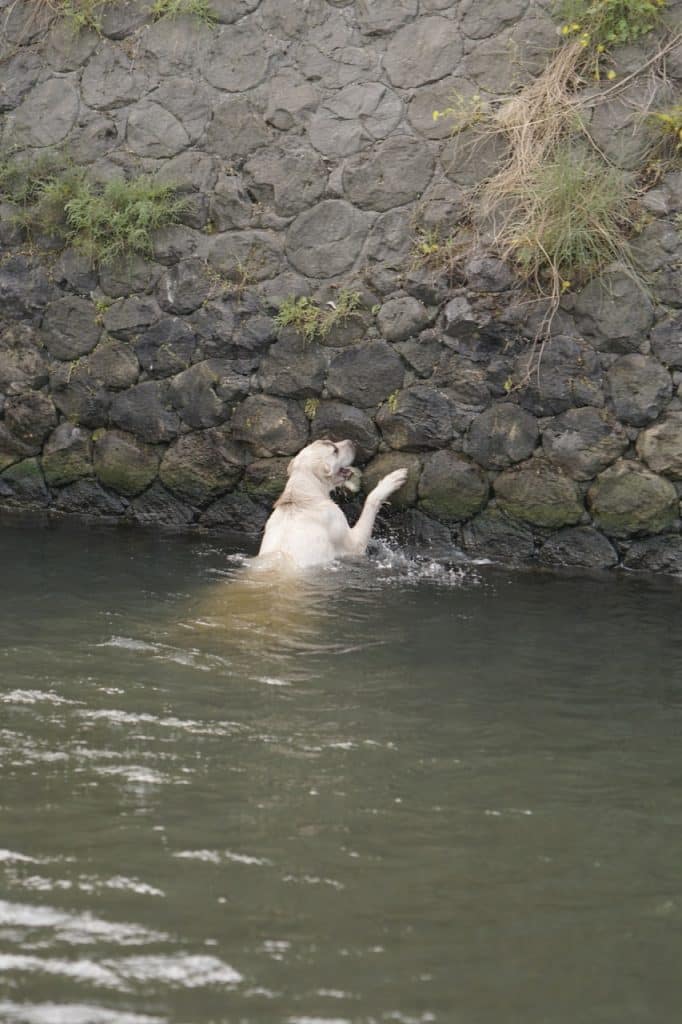 A small white dog had fallen into a deep water channel bordered by tall, steep stone walls. The sides were slick. The incline unforgiving.