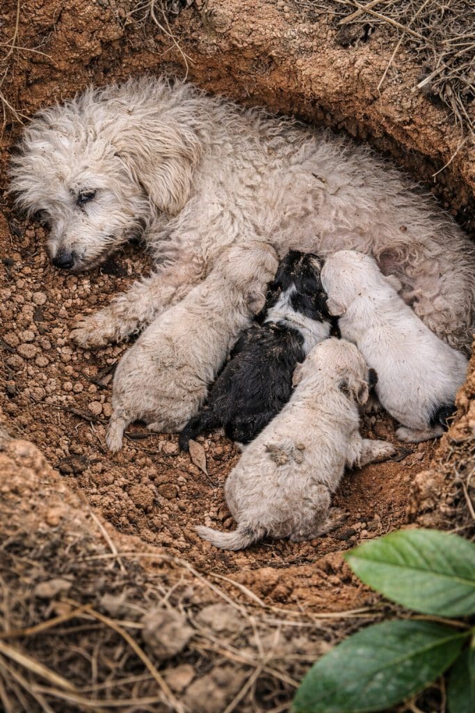 When the rescuer followed her, she led him through thick bushes, pushing past branches and damp leaves. Beneath the roots of a tree, tucked into a small hollow she had dug herself, lay her newborn puppies.