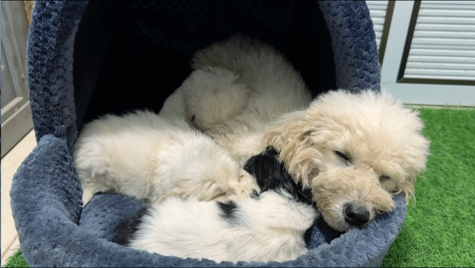 A sturdy box lined with soft fabric became the puppies’ first real bed.