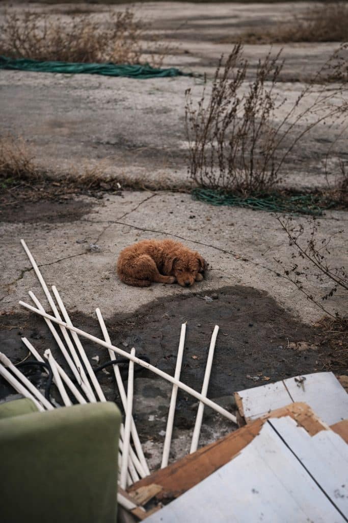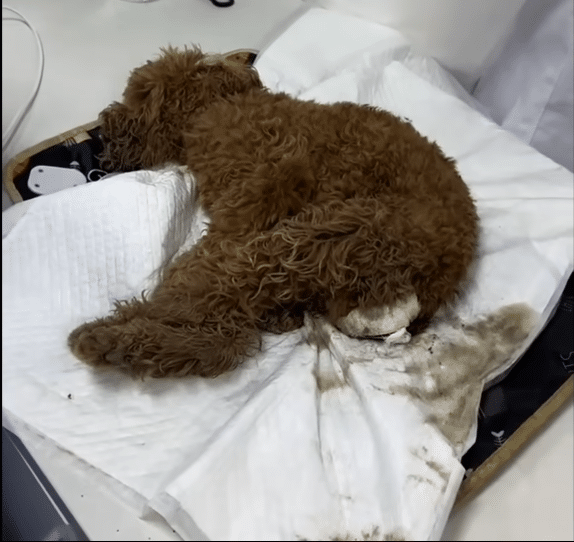 Curled between broken concrete and scraps of trash lay a small dog, barely conscious. His body was so thin that every rib was visible. The temperature had dropped to -3°C, and each gust of wind made him tremble.