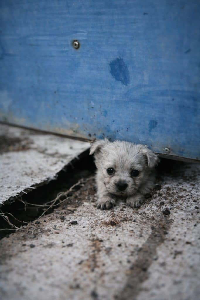 On a quiet day, a man walking past an abandoned lot heard soft whimpering coming from somewhere deep inside the weeds and broken concrete. He followed the sound carefully and spotted a tiny puppy hiding in the rubble. The little one was trembling, thin, and clearly alone.