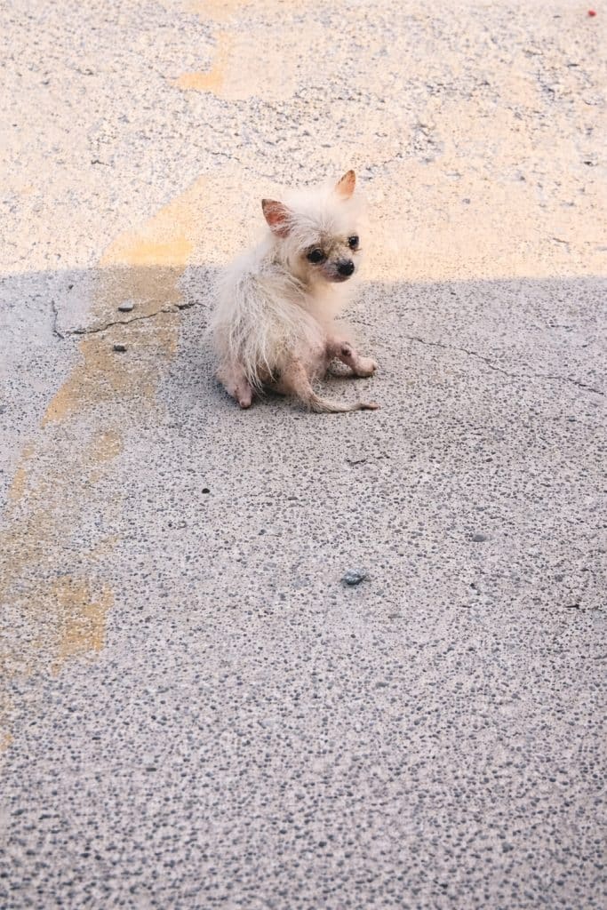 A store owner noticed a tiny stray dog lying near the entrance. At first glance, it was hard to tell how long he had been there. His body was painfully thin. Most of his fur had fallen out due to severe skin disease. His back legs wobbled as if they could no longer support him.