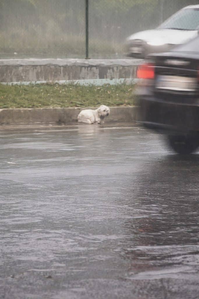 Cars rushed past without slowing. Water pooled along the roadside. And there, curled tightly against the curb, lay a small cream-colored stray dog. His thin body trembled as rain soaked through his fur. He looked painfully alone—fragile and exposed in a world that seemed too busy to notice.