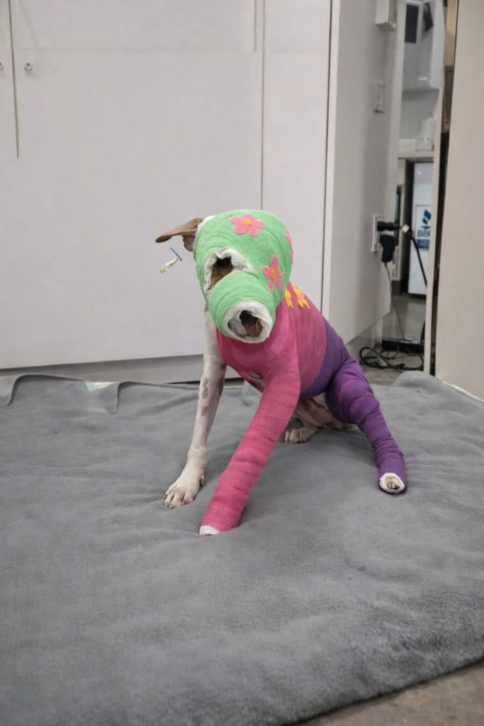 When she reached the veterinary clinic, her condition was critical. Large portions of her skin were severely burned. Her fur had been scorched away. Around her neck, there was a deep wound from a chain that had once been pulled too tightly.