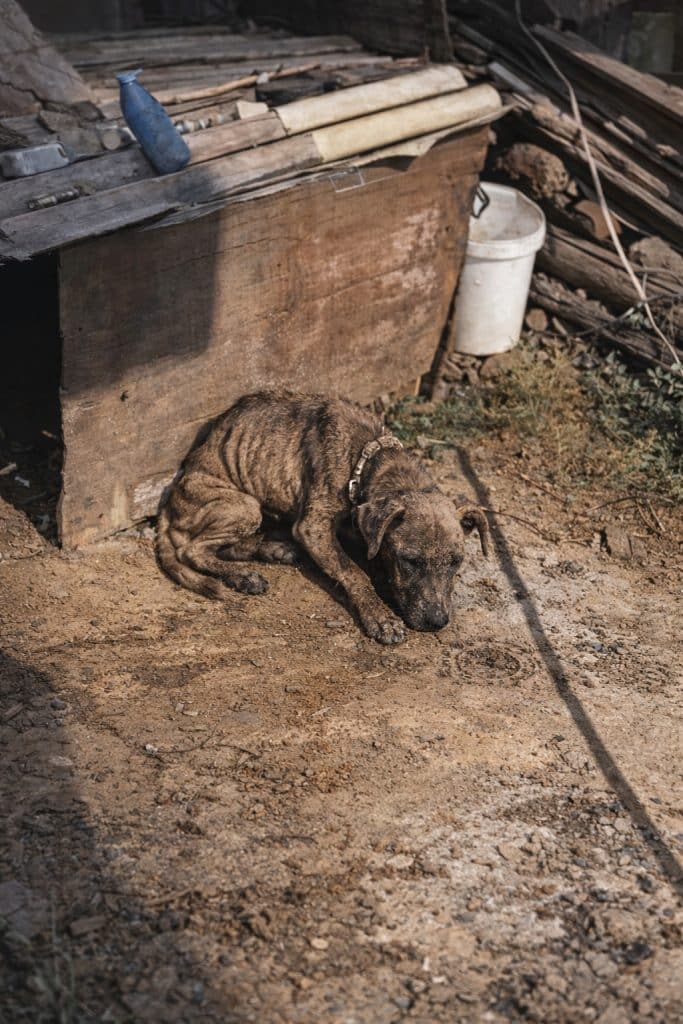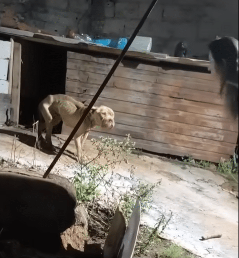 A neighbor had recorded a short clip and shared it, hoping someone would care enough to respond. In the video, a skeletal dog lay beside a crumbling wooden shed. Bricks, debris, and trash surrounded him. His body was thin to the bone. His movements were slow and heavy.