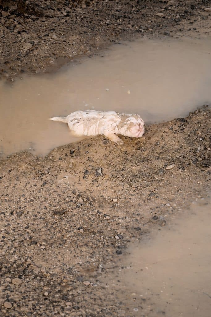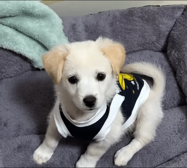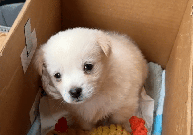 A tiny white puppy, soaked to the bone, trembling in dirty rainwater. His body was barely moving. His eyes were half closed. He looked no more than three weeks old — still learning how to stand.