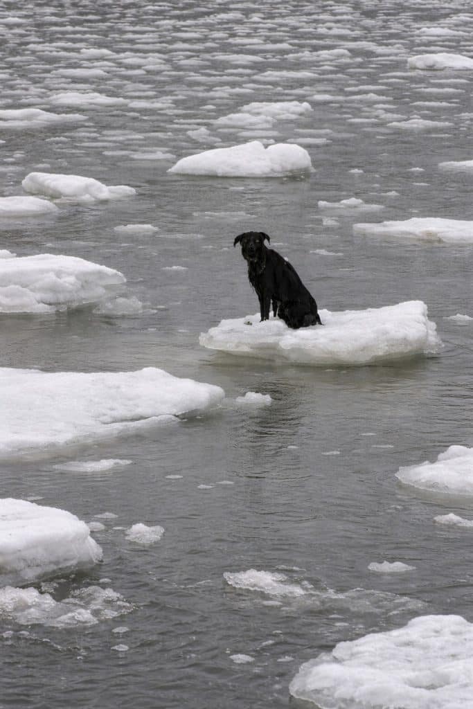 Wind swept across the icy water, pushing broken sheets of ice in slow, uncertain directions. And in the middle of that vast, silent expanse stood a single black dog.