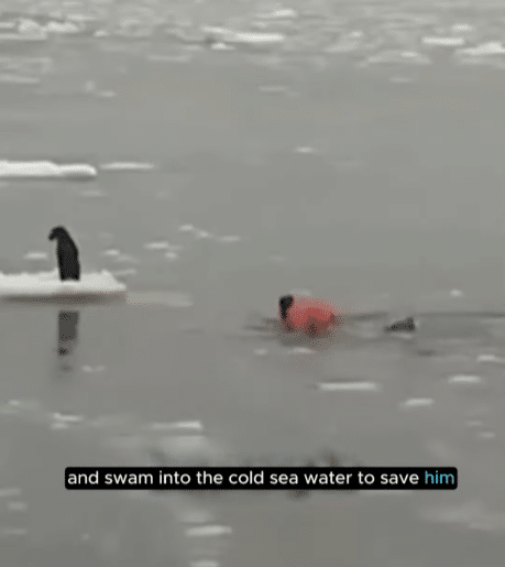 The water was brutally cold, scattered with floating ice fragments. The rescuer swam carefully, pushing aside chunks of ice to reach the drifting floe.