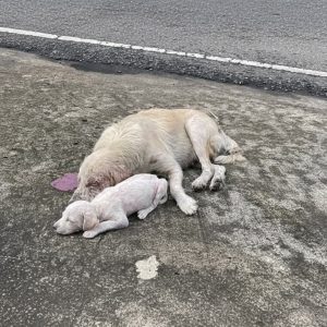On a quiet stretch of road where most people moved quickly, focused on their own destinations, a lone dog lay motionless on the pavement. She blended into…