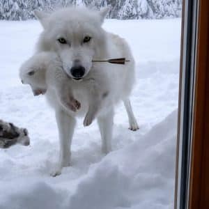 It was a winter morning wrapped in silence. Snow covered the yard in a thick white blanket. Then something moved beyond the glass door. A white wolf…