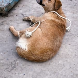 The video opens with a scene that feels almost unreal. A pregnant dog stands quietly as her owner ties her legs and wraps thick black tape tightly…