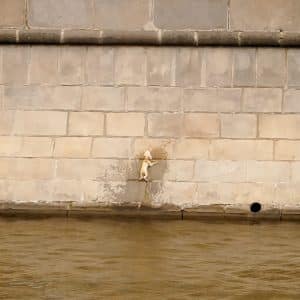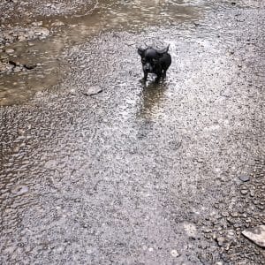 A Tiny White Puppy on a Stone Wall — With the River Below