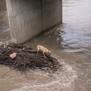 Stranded Beneath the Bridge, He Balanced on a Floating Pile of Debris
