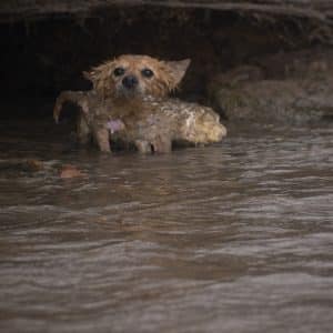 The rain had not stopped for hours.Streets blurred into rivers.Fields disappeared beneath rising water. And in the middle of it all, a small dog stood trembling. He…