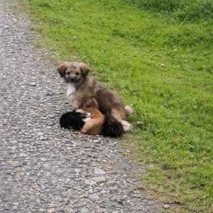 It started as a simple stop along the road. Two stray dogs were resting near the edge of the street—one black and white, the other smaller and…