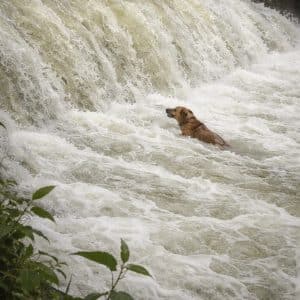 As floodwaters surged, the river changed in minutes. A brown dog was caught in the powerful current, pulled steadily toward the edge of a dam where the…