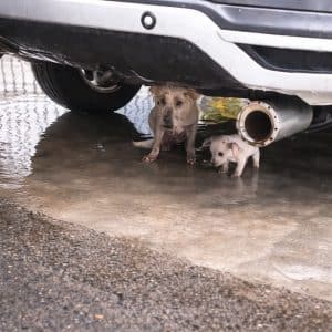 It was raining heavily that night. Thunder rolled above empty streets while a small white mother dog and her fragile puppy huddled beneath a parked car. Their…