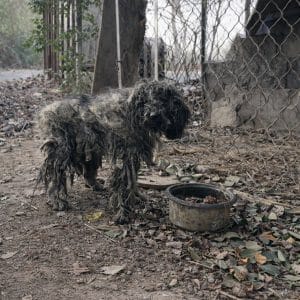 The video opens in the middle of a cold, relentless downpour. In a patch of mud beside rusted machinery, a skeletal dog stands trembling. His fur is…